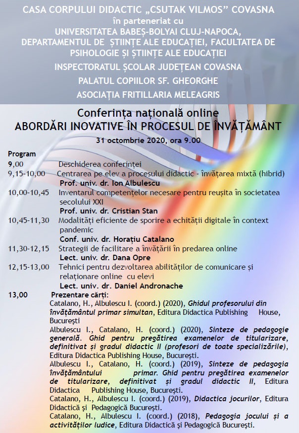 Casa Corpului Didactic "Csutak Vilmos" Covasna anunță cadrele didactice participante la programele de formare continuă Seria 3 (perioada septembrie-octombrie), că începând din data de 01.11.2020 se eliberează adeverințele de participare pentru programele: