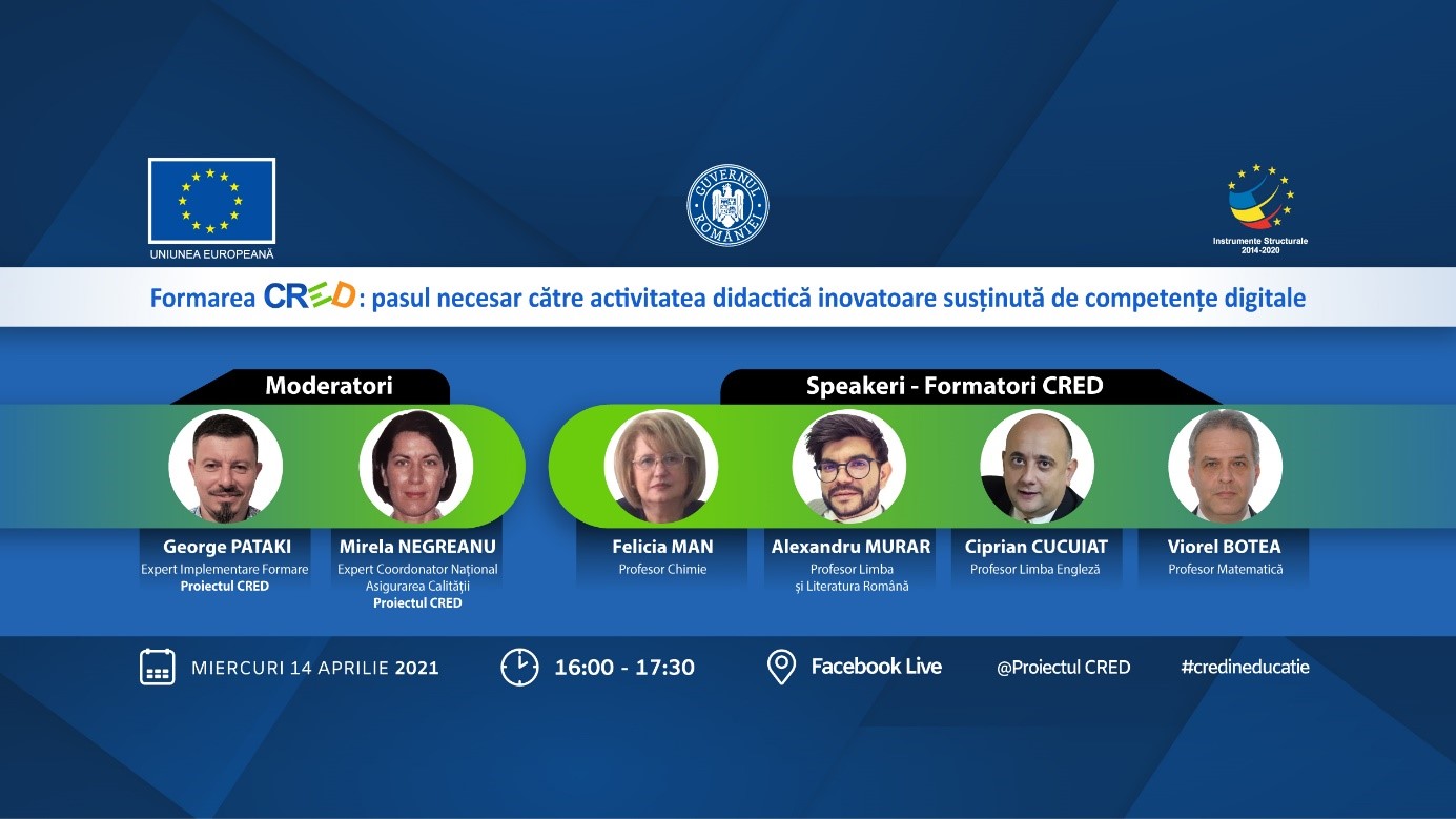 Evenimentul* „Formarea CRED: pasul necesar către activitatea didactică inovatoare susținută de competențe digitale” va fi unul dinamic, interactiv, fiind bazat pe dialog și schimburi relevante de informații și idei. De asemenea, gazdele vor răspunde, chiar în timpul evenimentului, la întrebările transmise de către cei care asistă la transmisiunea live.