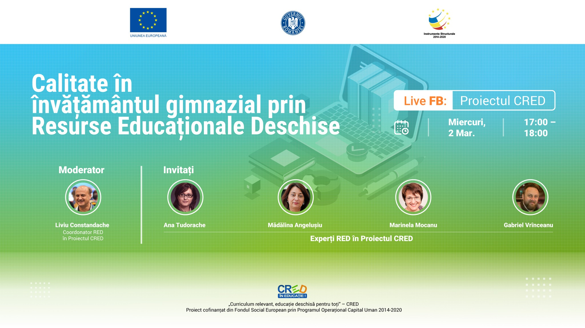 Vă invităm, așadar, miercuri, 2 martie, orele 17:00 – 18:00, la evenimentul online „Calitate în învățământul gimnazial prin Resurse Educaționale Deschise”, transmis LIVE pe pagina Facebook „Proiectul CRED”(click pentru acces) sau pe pagina dedicată evenimentului(click entru acces), la o sesiune de prezentări interactive despre RED susținute de o parte dintre experții care au realizat resursele pentru nivelul gimnazial: doamnele profesoare Ana Tudorache, Mădălina Angelușiu și Marinela Mocanu și domnul profesor Gabriel Vrînceanu.