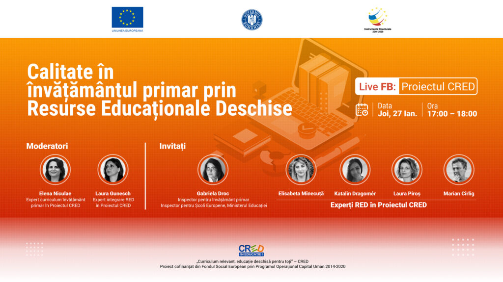 Proiectul „Curriculum Relevant, Educație Deschisă pentru toți” - CRED prezintă „Calitate în învățământul primar prin Resurse Educaționale Deschise”, un nou eveniment online marca ”Proiectul CRED”, organizat joi, 27 ianuarie, orele 17:00 - 18:00.